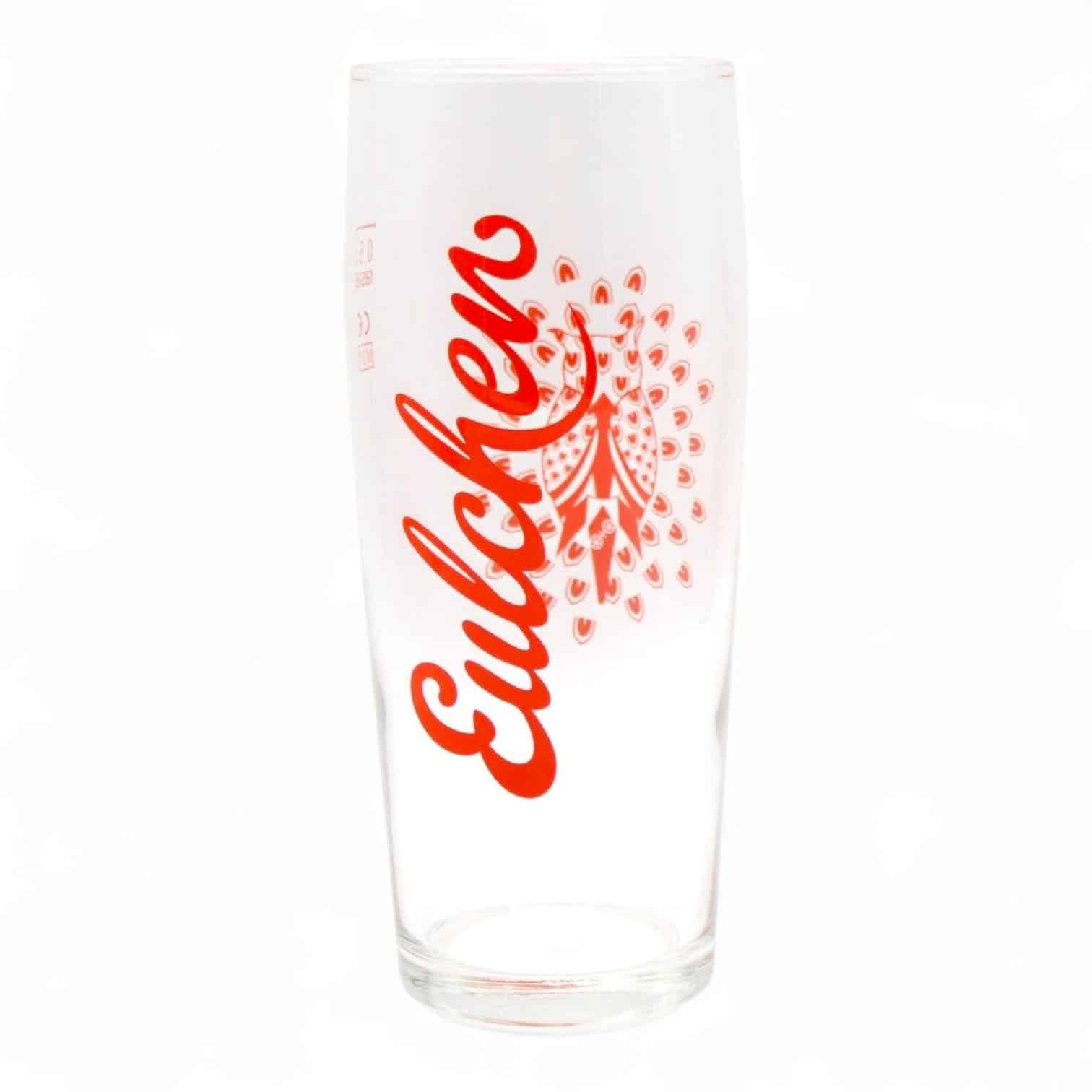 0,5 L Glas mit Eulchen-Schriftzug und Aufdruck der namensgebenden Eule als Wappentier der Eulchen-Brauerei.